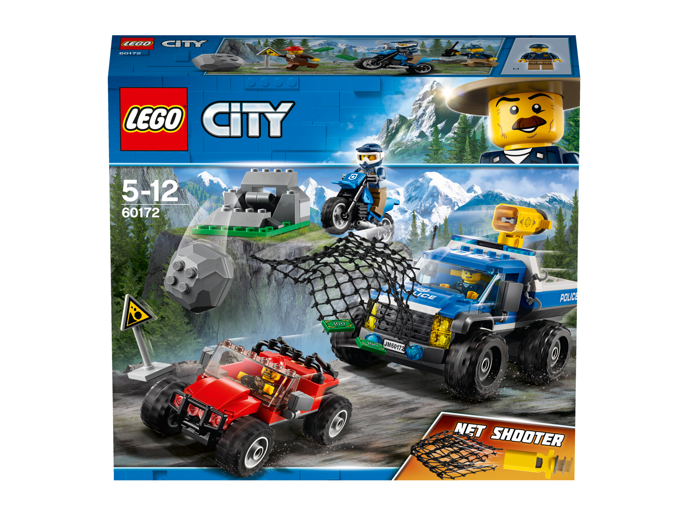 Setz dich hinters Steuer und nimm die Verfolgungsjagd auf Schotterpisten durch die Berge auf. Enthält einen Polizei-Quad mit Netzwerfer, Polizei-Motocross-Motorrad, Geländefahrzeug der Räuber, Steinschlagelement und 3 Minifiguren.